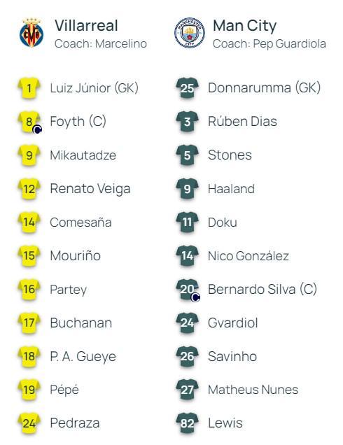 曼城客战比利亚雷亚尔:哈兰德、多库、尼科、刘易斯首发